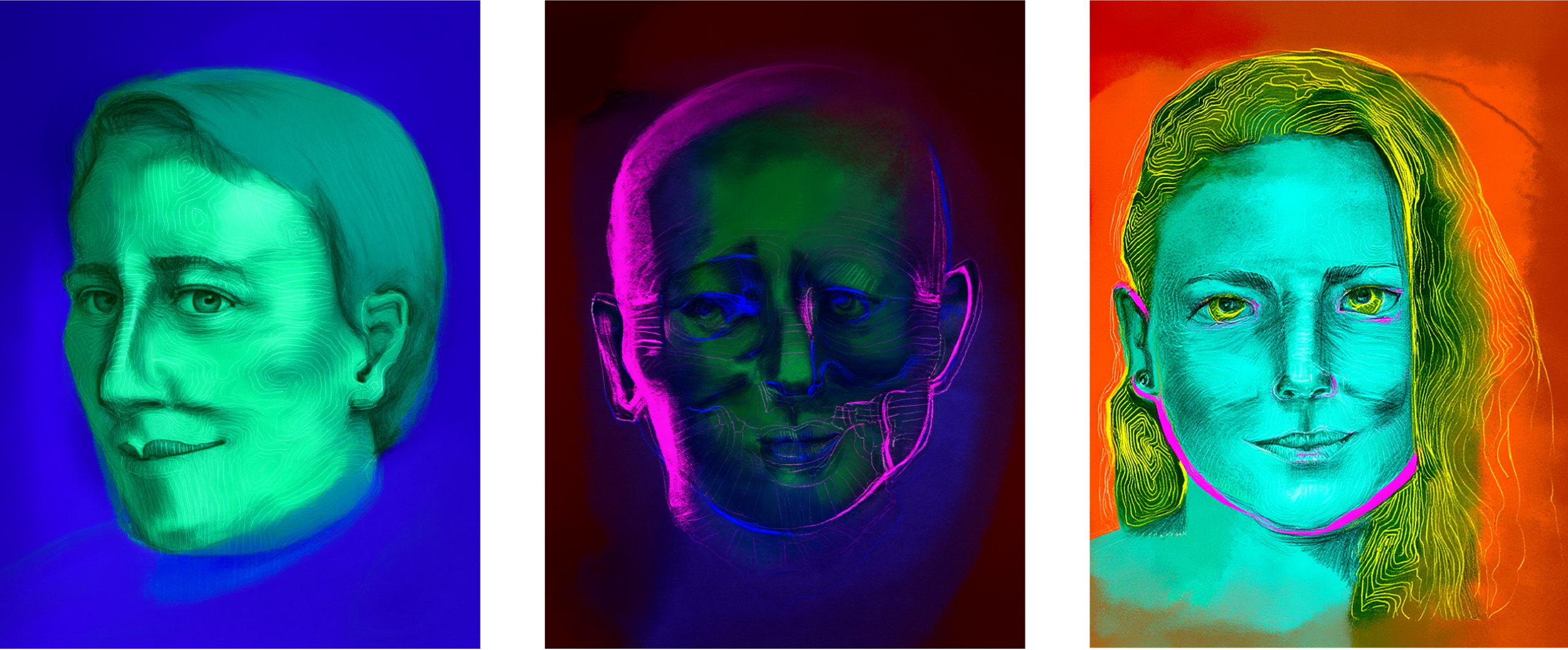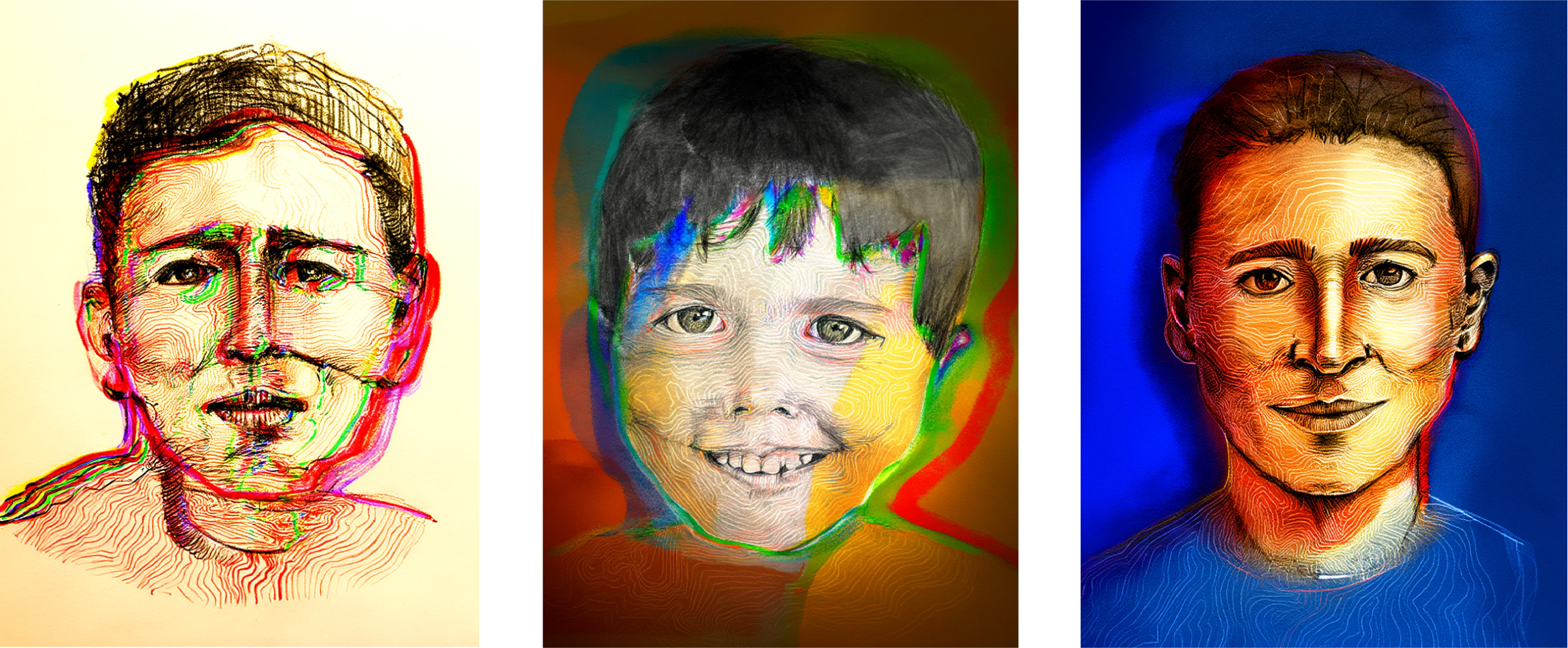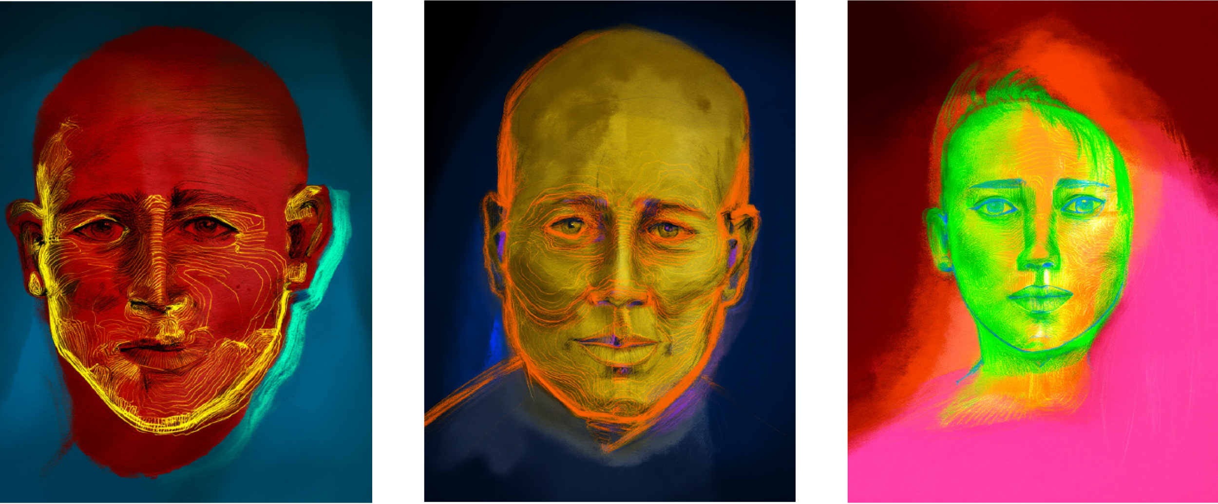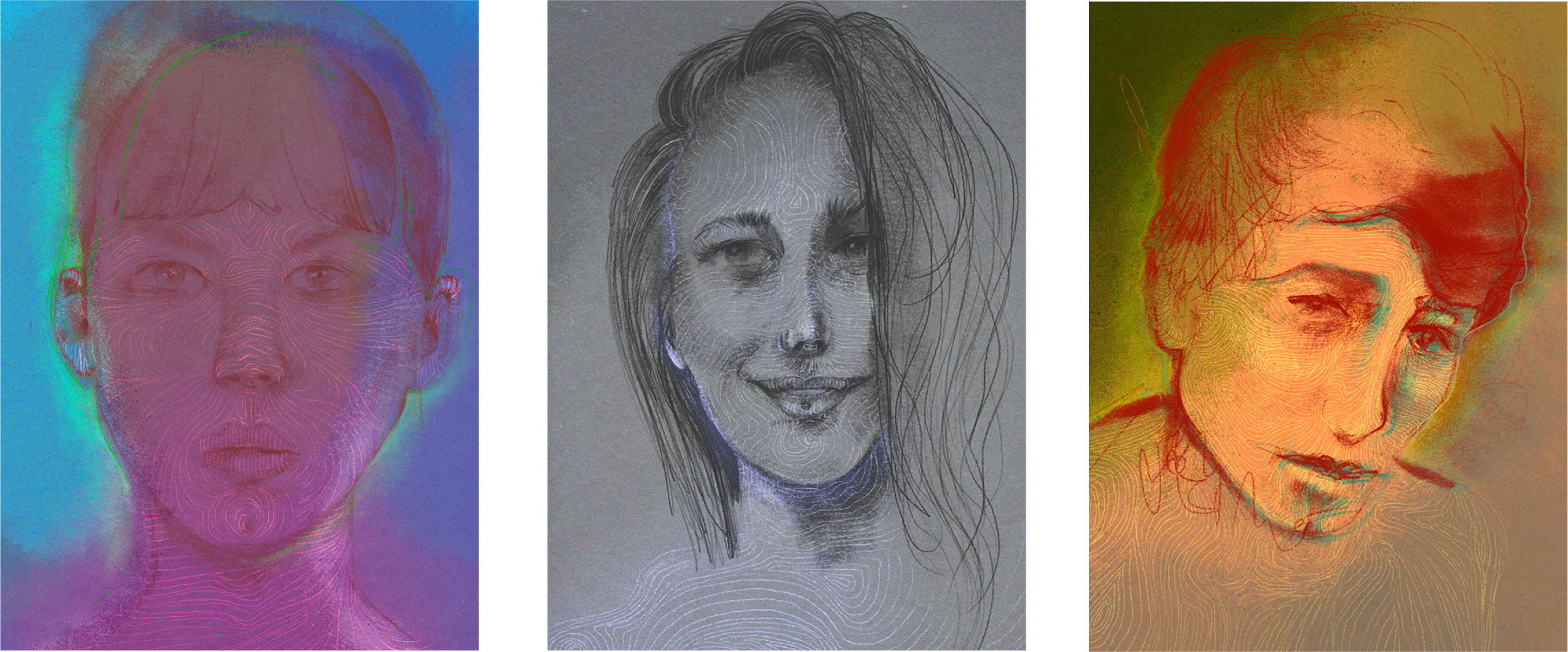 The generated images began to show: dominant pencil-like line work, contour mapping along facial planes, layered atmospheric backgrounds